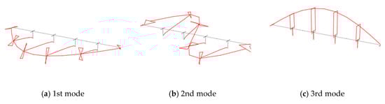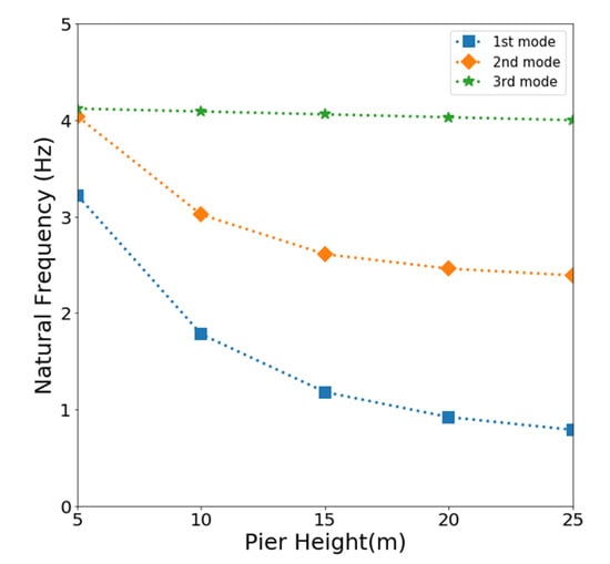 Modal analysis was performed to analyze the natural frequencies and mode shapes of the bridge. Figure 7 shows the mode shapes of the bridge obtained from the modal analysis. The first and second modes appeared in the bending shapes in the transverse direction, and the third mode appeared when bending in the vertical direction. The natural frequency tends to decrease with increasing pier height, as shown in Figure 8. In the first and second modes, the natural frequencies of the bridge significantly decreased with increasing height to 15 m. At a pier height higher than 15 m, little change in the natural frequency was found. The natural frequency of the third mode was almost constant, irrespective of the increase in the pier height. This indicates that the natural frequencies of the first and second modes of the bridge were largely affected by the change in structural configuration, but those of the third mode were not observed.
