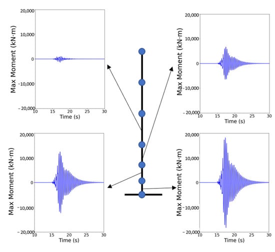 Figure 13 shows the variation in the maximum moment as the height of the bridge increases. The maximum moment was more significant when the bridge was subjected to near-fault ground motion than when subjected to far-fault ground motion. In particular, as discussed regarding the maximum displacement, near-fault ground motion with the flip-step effect showed a maximum moment larger than those with the forward-directivity effect. A maximum moment of approximately 26,600 kN·m occurred when the bridge with a height of 5 m was subjected to the EQ7_NF near-fault ground motion with the fling-step effect. For high, tall bridges, the fling-step near-fault ground motion also produced relatively high values of the maximum moment ranging from approximately 17,500 to 25,000 kN·m. On the other hand, when the bridge was subjected to far-fault ground motion, the largest maximum moment was approximately 7600 kN·m at the bridge with a height of 20 m. The maximum moment of a bridge subjected to the forward-directional ground motion tended to decrease with increasing bridge height. That is, in the case of far-fault ground motion and near-fault ground motion with the fling-step effect, the decreasing trend of the maximum moment with increasing bridge height was indistinct. Furthermore, the ground motion with the fling-step effect remained a high maximum moment, barely affected by the bridge height.