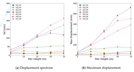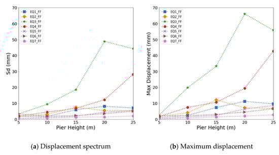 This study evaluated the effects of the bridge height on the maximum displacement of the bridge and the displacement spectrum of the ground motion. Figure 11 and Figure 12 show the relationship of the maximum displacement and displacement spectrum according to the height of a bridge for near-fault and far-fault ground motions, respectively. The displacement of the bridge due to earthquakes showed a similar tendency of an increase or decrease with the displacement spectrum as the aspect ratio of the bridge increased. In particular, for a 5 m high bridge, little difference was found between the maximum displacement and displacement response. This indicates that when the height of a bridge is low, the type of ground motion dominates the seismic behavior of the bridge. As the height of a bridge increased, however, the maximum displacement became larger than the spectral response. This is because a real bridge composed of various structural and non-structural elements has a much larger mass and higher complexity than the structure assumed in spectral analysis.