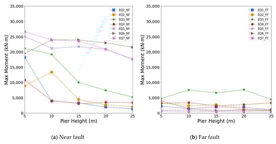 Maximum moment with increasing bridge height: (a) Maximum moment under near-fault ground motion; (b) Maximum moment under far-fault ground motion.