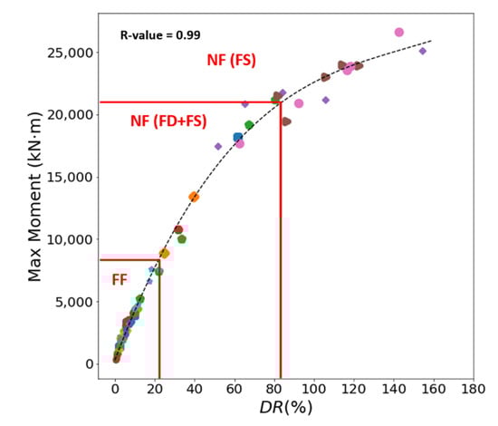 Figure 14 presents a scatter plot of the maximum moment and DR for all the bridges under both the near-fault and far-fault ground motions. When subjected to far-fault ground motions, the bridges showed the maximum moment within approximately 25% of the DR. In the case of near-fault ground motions with forward directivity, the maximum moment reached as much as approximately 80% of the DR. In particular, some near-fault ground motions with the fling-step effect were shown to be larger than 80% of the DR. A DR higher than 100% means that the displacement response exceeds the yield displacement capacity of the bridge, resulting in the yielding of the bridge under an earthquake. The maximum moment tends to increase as the DR increases, but the rate of increase in the maximum moment decreases when the DR exceeds approximately 80%. According to a regression analysis, curve fitting showed a very good relationship between the maximum moment and the DR with a correlation coefficient (R-value) of 0.99. The DR proposed in this study showed a very good estimation of the maximum moment of a bridge, which was difficult to predict using only the maximum displacement response.