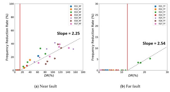 Figure 15 plots the reduction of the natural frequency in terms of DR. Both the near-fault and far-fault ground motions showed no decrease in the natural frequency when the DR of the bridge was less than 12.5%. Therefore, this study investigated the relationship between the DR and the decrease in the natural frequency for a DR larger than 12.5%. Linear regression analysis showed that the decrease in the natural frequency was associated with the increase in the DR, as shown in Figure 15. Compared with the far-fault ground motion, the near-fault ground motion with forward-directivity and fling-step pulses significantly increased the DR and reduced the natural frequency. The linear regression line shows a relatively larger dispersion in the near-fault ground motion than in the far-fault ground motion, as shown in Figure 15. The rate of decrease in the natural frequency due to the far-fault ground motions was similar to that due to the near-fault ground motions. The rate of decrease in the natural frequency was approximately 2.25% for the near-fault ground motions and 2.54% for the far-fault ground motions as the DR increased.