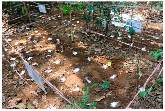 Untreated, imidacloprid treated, and furfurylated specimens were embedded in-ground for the field test to determine their resistance against to subterranean termite field test of the samples was carried out in the Arboretum of the Forestry Faculty, Bogor Agricultural University (IPB), Bogor, Indonesia. The field test was carried out by vertically inserting each specimen into the ground to three-fourths of its length for the exposure period lasted for three months, as shown in Figure 1 [14]. At the end of the test period, the samples were lightly brushed to clean residual soil before visually inspection and weighed after they were oven-dried. The microclimate in the surrounding area during the test period, mid-October 2019 until mid-January 2020, had an average rainfall of 23.5 mm∙d−1 ranging from 0.0 to 141.0 mm∙d−1, average relative humidity of 82.5% ranging from 61.0% to 96.0% [15].