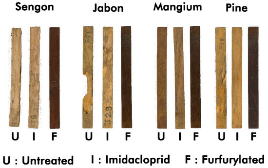 Untreated control and imidacloprid-treated specimens were also considered for the experiment for comparison purposes. For imidacloprid treatment, specimens with 12% MC were treated with a 3% imidacloprid solution using the same vacuum-pressure process as used for the furfurylation. Retention of the preservative was also measured by weighing the specimens before and after the preservation process. A total of ten samples were used for each treatment combination. Chemicals used for the experiments were supplied by Our Chemicals, Fisher, Jakarta, Indonesia.