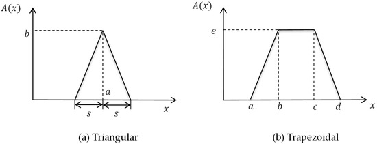 The parameters a, b, and s of the triangular function are portrayed in Figure 3a: a value a, a distance s, a membership function value b, a lower limit , and an upper limit . The parameters a, b, c, d, and e of the trapezoidal function are portrayed in Figure 3b similarly.