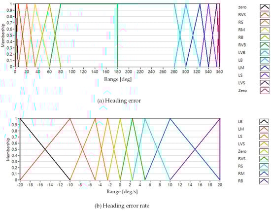 Using the triangular membership function, two parameters—heading error and heading error rate—were defined as input functions. Figure 4a presents 12 membership functions for the heading error: right zero (zero), right very small (RVS), right small (RS), right medium (RM), right big (RB), right very big (RVB), left very big (LVB), left big (LB), left medium (LM), left small (LS), left very small (LVS), and left zero (Zero). Membership functions for the heading error rate are presented in Figure 4b.