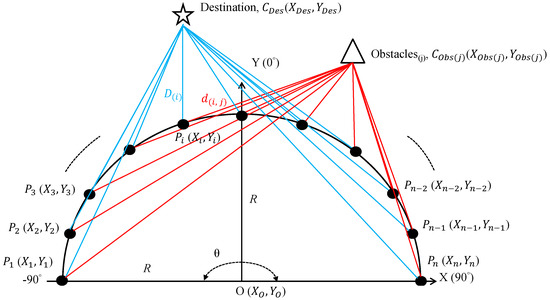 Figure 6. Optimum value computing of the obstacle avoidance approach: the destination , the obstacles , the point P on the radius of the scanning sonar, the distance between point P and the destination, and the distance between point P and the obstacle. - Defining an objective function: The objective function must be defined according to the purpose and requirements of the approach. The objective function in this study was defined as the direction of movement (DM) of the ROV:andwhere represents the distance between point P and the destination, and represents the distance between point P and the obstacle. indicates the negative inverse value of , and indicate the positive inverse value of due to the presence of n obstacles detected. If the minimum value of DM is located at point “i”, the ROV should turn to point “i” and move forward.