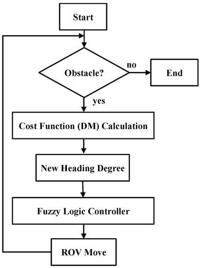 This study used an ROV to analyze vehicle movement, heading in degrees, and altitude data through the use of sensors. FLC used sensor data to navigate the ROV and enabled the vehicle to self-adjust the motor power compensation output. Using scanning sonar with optimum value computing enabled successful avoidance of obstacles, and the ROV could pass through them to the target.