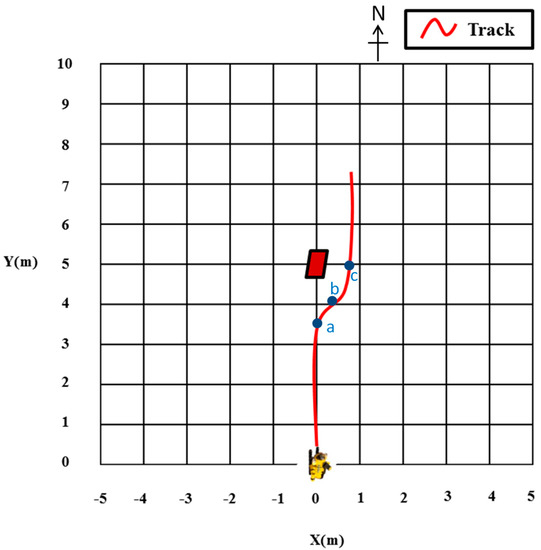 Figure 9 presents the simulation results of the obstacle avoidance approach. The red line indicates the trajectory of the ROV with the result of obstacle avoidance by optimum value computing. The heading (degree) of the destination is defined as the north of the map. The ROV started toward the destination from origin point (0, 0). At point “a”, an obstacle was detected and the ROV turned right 60° to avoid the obstacle. At point “c”, no obstacle was detected, and the ROV traveled toward the destination.