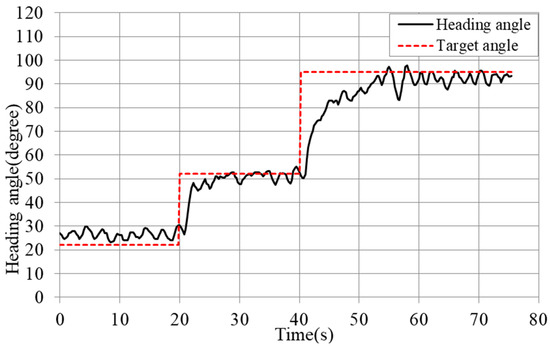 The ROV initially began with a heading of 22° and was driven forward for 20 s. The ROV then turned clockwise toward the subsequent target heading of 52°. The heading was maintained at 52° for 20 s. The ROV then turned clockwise to the third target heading of 95° and locomoted for 55 s. The root mean square error (RMSE) values of the multiheading control were calculated as shown in Equation (14), where indicates the data points (heading), xtarget indicates the target heading, and n indicates the total number of data points.