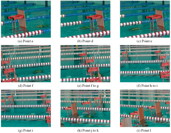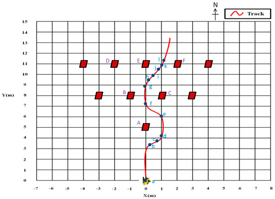 Figure 12 presents the experimental results of the ROV’s multiple obstacle avoidance. The obstacles are identified by purple upper-case letters, the points of the scan map are marked by blue lower-case letters, and the red line signifies the trajectory of the ROV with the results of obstacle avoidance by optimum value computing. In the obstacle avoidance experiment, the target heading was due north according to the map orientation, and the radius R of the obstacle avoidance approach was 1.7 m. The ROV started toward the destination at point “a”. From point “b” to point “d”, the ROV successfully avoided the first obstacle. Between points “d” and “e”, the ROV continued to travel toward the destination. From point “e” to point “g”, the ROV smoothly avoided the middle row of obstacles “B” and “C”. At point “g”, the third row of obstacles, “D”, “E”, and “F”, was detected. The ROV chose to turn right 60° and traveled between obstacles “E” and “F” from point “h” to point “k”. Finally, the ROV again traveled toward the destination from point “l”.