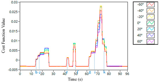 Simulated cost function values. The horizontal axis is time (s). The vertical axis is the cost function value. The points of the scan map are marked by blue lower-case letters.