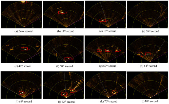 Figure 13 presents the cost function values of optimum value computing. In total, seven points were defined as simulation parameters. The total time of the ROV obstacle avoidance experiment was 96 s. The lowest cost function values made the ROV change direction to avoid the obstacles. As shown in Figure 13, obstacles were avoided three times by the ROV. At 14 s to 26 s, the ROV turned right 60° because the point at 60° (purple) was calculated as having the lowest value of the cost function. After passing around obstacle “A”, the middle row of obstacles made the ROV turn left 60°, because the point for −60° (red) had the lowest cost function value. Finally, the third row of obstacles made the ROV turn right 60° again on the basis of the cost function for 60° (purple). Figure 14 reproduces images of the scanning sonar. Figure 15 presents the side view images of the experiments.