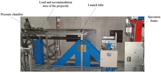 The high-velocity impacts were carried out on plates of Kevlar bi-directional woven laminates with surface of 100 × 100 mm2. The specimen’s size was big enough that the damaged area did not reach the border of the laminate. The projectile used for impact tests was of steel with a spherical geometry of 7.5 mm diameter and a density of 7800 kg/m3. In order to carry out the impact tests, a gas gun (Figure 1) was used to impulse the projectile at the required velocity. This gas gun consists of several clearly differentiated zones: the load and accommodation area of the projectile, the pressure chamber that impulses the projectile against the target, a launch tube and a frame where the laminate is embedded.