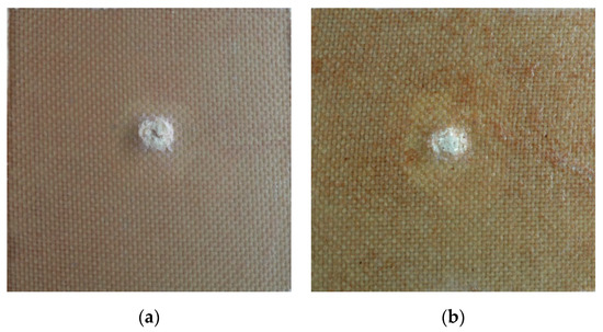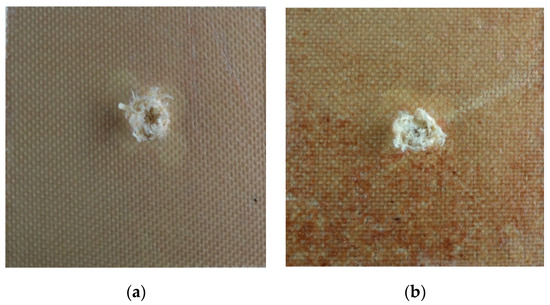 Damage area of the back side. (a) Specimen of Kevlar impacted at 231 m/s and (b) specimen of Kevlar + cork powder impacted at 230 m/s.