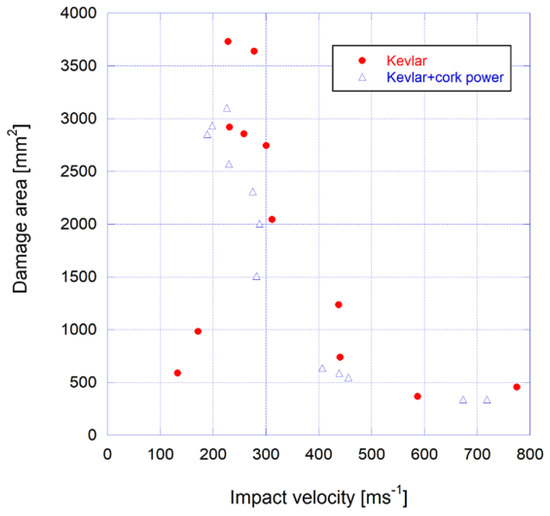 Therefore, the minimum velocity of perforation is about 206.35 ± 4.20 m/s for Kevlar laminates with neat resin, while for that with resin filled with cork powder is around 209.71 ± 4.63 m/s. Regardless of the small difference in terms of average values (1.6%), both values are similar because they are within the experimental dispersion. In fact, cork is a hydrophobic material with a surface energy of 18 mN.m−1, while the typical cured epoxies have surface energy of about 45 mN.m−1 and a poor adhesion occurs for substrates with a surface energy of 30 mN.m−1 or lower. However, this weakness is countered by the larger external surfaces of the particles [36]. Regardless of the improvements obtained in terms of surface energy using surface treatments [43,44], Barbosa et al. [44] report that some of them destroy part of the honeycomb structure of the cork cells (erosion of cork cell walls). In this case, the damage caused to the particles can facilitate the penetration of the resin with the consequent decrease on the absorption of energy, because the damping effect of cork is lost. Therefore, while the bonds that occur when the adhesive diffuses into cell walls to build chemical bonds with the cell’s chemical components are weaker, the particles’ morphology promotes the physical bonds with the penetration of the epoxy resin into the open cells and consequent mechanical interlocking. In this context, the cork particles are surrounded by resin, and the closed cells that contain air inside can deform when they suffer an impact force and absorb that impact [44]. For this reason, small particles show less improvement than larger particles, because the number of open through-cut cells increases, and the resin does not allow the cell deformation. Consequently, they cannot absorb as much energy. Therefore, the response of the cork/resin composite is influenced by the number of closed cells in the particle [44].
