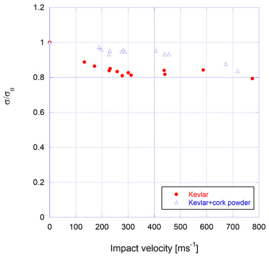 Finally, Figure 9 shows the residual bending strength, where σ is the average bending stress for each velocity and σ0 is the average bending stress obtained from the 3PB static tests for each laminate.