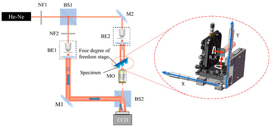 Schematic of the digital holography microscopy (DHM) system setup in transmission configuration with four degree of freedom stage.