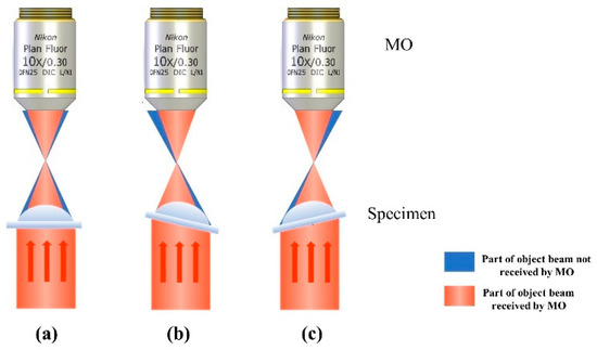 Furthermore, the microscope, whose NA decides the frequency bandwidth of the whole measurement system, was just like a low pass filter and the object wave corresponding to the large gradient region of sample carried high frequency spatial information, so we can say the NA of MO severely restrict the capability to measure the large gradient topography. In conventional DHM, if the large gradient object whose NA is larger than the NA of MO then it is vertically transmitted by a plane wave, as shown in Figure 2a, only the red part of beam which carry the topography information of small gradient region of object can be received by MO. Meanwhile, the blue part of beam was lost and cannot generate a dark area without any surface information in hologram. However, in the multi-angle stitching method, the DHM system was improved by adding four degrees of freedom stage which can provide multiple inclination angle for the sample. By means of rotation, the angle between normal direction of the large gradient region of sample and direction of incident ray was decreased and the area’s surface feature can be captured by MO, as shown in Figure 2b,c and we can also measure shape surface with larger gradient while rotation angle was adjusted to be larger. Finally, the whole topography of sample was reconstructed by processing a group of holograms corresponding to multiple rotation angles, as illustrated in the following section.