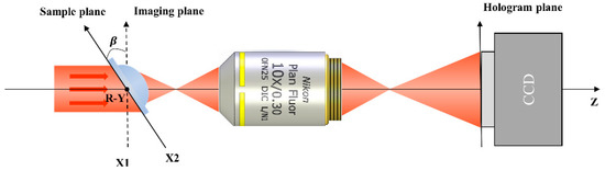 Furthermore, the following three steps which need to be completed to recover the surface shape of the large gradient micro-structure accurately. First, the acquired multiple object waves carry different rotation angles, so the coordinate system of these object waves must be unified by employing the diffraction calculation between tilted planes [16,17]. As is shown in Figure 4, the sample plane X2 which share the origin with the imaging plane X1 was tilted with respect to the imaging plane with the angle of around the R_Y axis, and CCD can only capture the object wave in the imaging plane. The angular spectrum of wave distribution on the imaging plane is calculated by FFT: