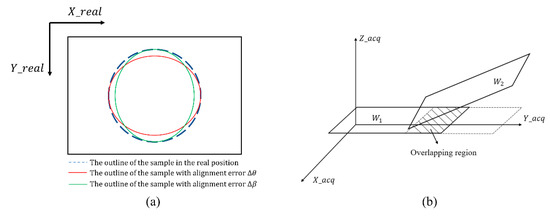 The last step was stitching the algorithm based on overlapped region. We have got multiple sub-surfaces of sample at different angles of tilt through the above diffraction calculation and topography reconstruction algorithm. However, due to the existence of mechanical motion, it was impossible to assure precise position and pose parameters of the tested sample. As shown in Figure 6a, the alignment tolerance , of two rotary axes R_X, R_Y is introduced, respectively, because of the addition of rotation angle of sample. So, the coordinate of the acquired sub-surfaces and the coordinate of the real sub-surfaces have the following relationship:
