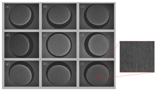 Holograms of microlens with nine different rotation angles. (a) = 10°, = 10°. (b) = 0°, = 20°, (c) = −10°, = 10°, (d) = 20°, = 0°, (e) = 0°, = 0°, (f) = −20°, = 0°, (g) = 10°, = −10°, (h) = 0°, = −20°, (i) = −10°, = −10°.