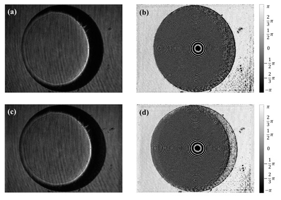 Before the measurement, the angle parameters of four degrees of freedom stage for measuring the whole sample are unknow quantities, so we need to adjust arbitrarily the angle of rotary axes (R_X, R_Y) and observe the variation of the bright region of hologram. In this process, we can find several holograms whose bright areas overlap each other, and the combination of these areas can cover the whole topography of microlens, while rotation angles corresponding to these holograms as the actual angle parameters are recorded. As shown in Figure 8, nine holograms are captured by controlling the four degrees of freedom stage that offers nine different rotation angles to microlens. It is assumed that , represent the rotation angles around R_X and R_Y axis, respectively. For the conventional DHM system, only Figure 8e, have a black ring region without fringes in which the corresponding topography information is lost due to the limitation of MO, can be collected. With our method, the remaining hologram (Figure 8a–d,f–i) which contain the information of black ring area are captured by our system, a larger gradient micro-structure can be characterized by adding bigger rotation angle to the sample. To show the effect of the diffraction calculation between tilted planes proposed in Section 2.2.2, the difference between the unprocessed object wave ( = 20°, = 0°) and the processed object wave by the algorithm is illustrated as shown in Figure 9. The acquired image from CCD in Figure 8a have an elliptical outline because of the rotation of microlens around R_X axis. After using the algorithm, the outline of the image is restored to a circle as is shown in Figure 9c. The significant correction effect is also reflected in the phase images (Figure 9b,d).