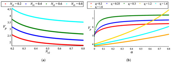 Variation of Vp with regards to (a) Nr2 for different values of Nr1 (Mr = 3.75, Tni = 0.05, Te = 0.2, a = 0.5, and q = 1.6), and (b) a for different values of q (Mr = 3.75, Tni = 0.05, Te = 0.2, Nr1 = 0.5, and Nr2 = 0.1), respectively.