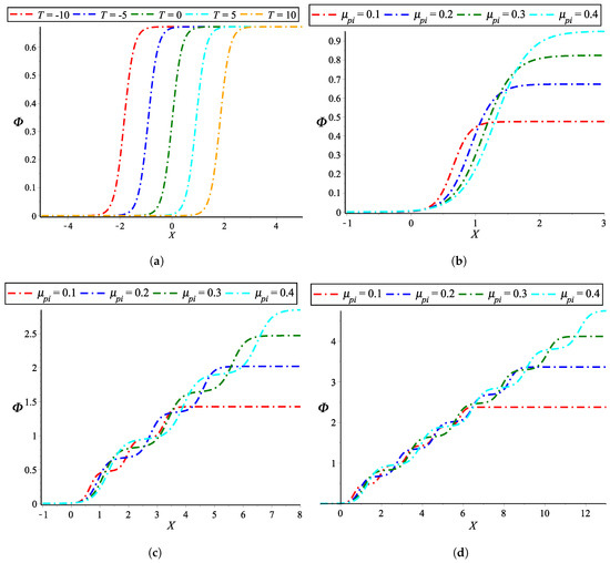 (a) Electrostatic single-shock wave excitation due to the variation of T with μpi = 0.3 and effect of μpi on the electrostatic (b) single-, (c) overtaking collision of triple-, and (d) overtaking collision of five-shock wave excitations with T = 5, respectively. The other parameters are chosen as a = 0.3, q = 0.35, Mr = 3.75, Tni = 0.05, Te = 0.2, Nr1 = 0.5, Nr2 = 0.02, and μni = 0.01.