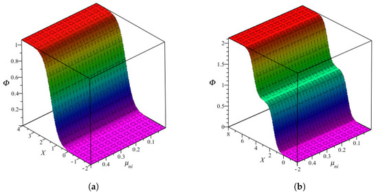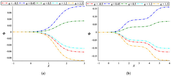 (i) Figure 1a,b shows, respectively, the variation of phase velocity with regards to and for different values of and q. It is observed from Figure 1 that the linear phase velocity () losses (gains) energy with increases the density ratio of electrons to positive ions (the density ratio of negative to positive ions). Whereas, loses (gains) energy with increasing q for the case of subthermality (superthermality). Moreover, gains more energy with increases the population of nonthermal nonextensive electrons.