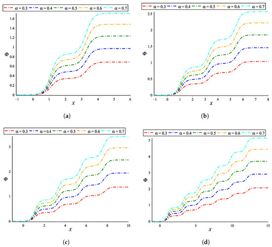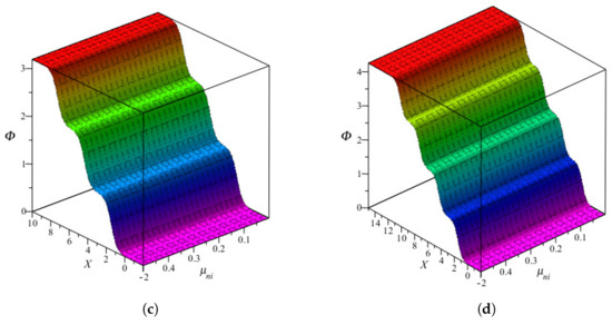 (ii) Figure 2b–d demonstrates the influence of on the nonlinear IA single-, and overtaking collision of triple-, as well as five-shock wave excitations, while Figure 2a demonstrates the IA single-shock wave excitation for different values of time T by choosing the other parameters constant. Besides, the influence of on the nonlinear IA single-, and overtaking collision of double-, triple-, as well as four-shock wave excitations by choosing the other parameters constant is demonstrated in Figure 3. It is evidently reveled from these figures that both and play a vital role in the formation of not only nonlinear electrostatic single-, but also overtaking collision of multi-shock waves in the negative ions plasmas. Because, the amplitude and thickness of monotonically shock wave remarkably increases with increases in , but very sightly increases with increases in . Besides, the amplitude and thickness of shock wave remains unchanged, but the position of shock wave changes with increases in time.