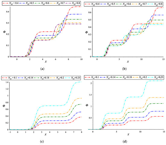 Effect of Nr2 when Nr1 = 0.1 on the electrostatic overtaking collision of (a) double-, and (b) triple-, and Nr1 when Nr2 = 0.8 on the electrostatic overtaking collision of (c) double-, and (d) triple-shock wave excitations, respectively, by choosing a = 0.3, q = 0.35, Mr = 3.75, Tni = 0.05, Te = 0.2, μpi = 0.35, μni = 0.05, and T = 10.