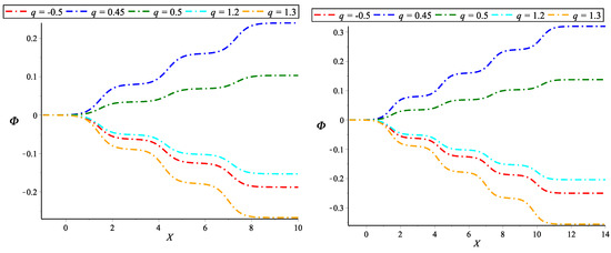 Effect of q on the electrostatic (a) single-, (b) overtaking collision of double-, (c) overtaking collision of triple-, and (d) overtaking collision of four-shock wave excitations, respectively, by choosing , , , , , , , and .