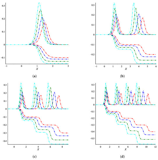 (iii) Figure 4 displays the influence of (Figure 4a,b) and (Figure 4c,d) on the nonlinear electrostatic overtaking collision of double- and triple-shock wave excitations by assuming other parameters are constant. It is found from Figure 4 that both density ratios remarkably play distinct roles to each other in the formation of overtaking collision of N-shocks in the considered plasmas. This is because the monotonically shock wave also occurred, in which the amplitude and thickness of shocks decreases monotonically with increases in . However, the amplitude and thickness of shocks increases with increases in .