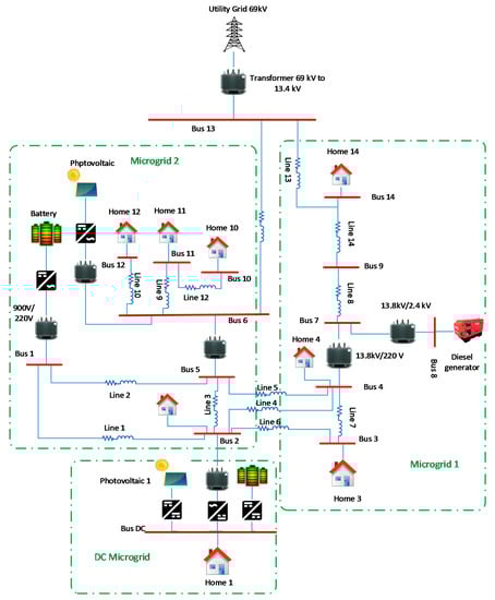 Figure 1. The location of the photovoltaic generator, batteries and diesel generator used in this article is also indicated. It consists of a substation, 14 lines, 14 buses or nodes and 9 houses. The house consists of a combination of constant current, continuous impedance and constant loads of power. The network proposed incorporates a microgrid with an electric transmission system of 69 kV. There were two voltage output stages. The primary voltage was 13.8 kV and the secondary voltage was 0.22 kV. In the proposed system, three sub-microgrids have been given: AC microgrid 1 is an AC microgrid 2-related area of 0.22 kV through lines 4, 5, 6. In addition, AC microgrid 1 provides electricity to 4 houses and is powered by a diesel generator. AC microgrid 2 is another area with battery power storage 2 and photovoltaic 2 feature. The two AC microgrids run at 50 Hz. Ultimately, the third zone is the photovoltaic 1 DC microgrid and a battery power storage system 1. The battery power storage system 1 is connected by a two-way buck-boost converter, while photovoltaic 2 and DC connections are connected by a boost converter. The DC Bus and the AC microgrid 2 are connected by two parallel bidirectional transformers, which can be used as inverters or rectifiers for two transformers to swap reactive and active power. Finally, this hybrid AC/DC system also has a load equivalent grid network and diesel generators.