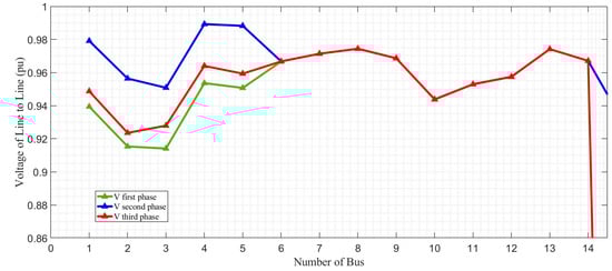 Figure 7, it can be seen that, under a peak demand situation, the maximum average voltage deviation for the system is up to 0.048 per unit. Nevertheless, this system is determined to have a maximum voltage deviation of 0.072 on bus 3 (first, second, and third stage values are 0.087, 0.05, and 0.08, respectively).