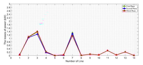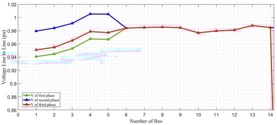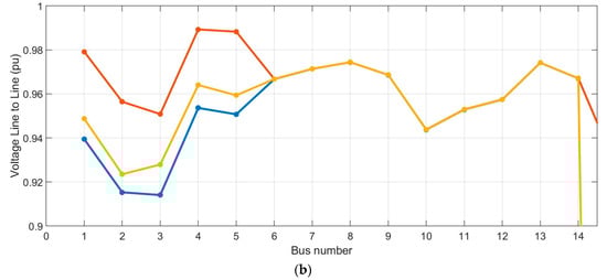 Figure 8 depicts the voltage profile for minimum load capacity. The system operates under single-phase loading leading to unbalanced loads, thereby warranting a voltage profile analysis. In both situations, the voltage profile adheres to the appropriate operating standards. Nevertheless, as highlighted in