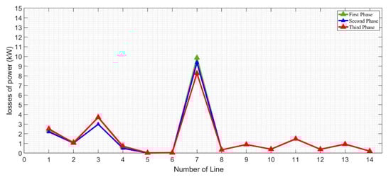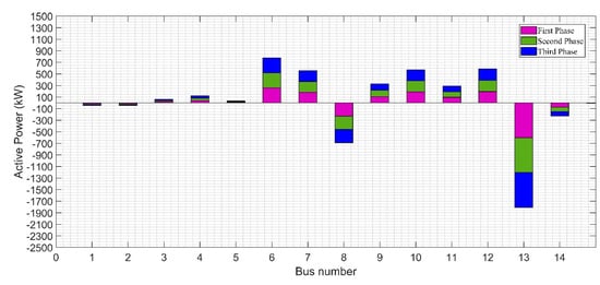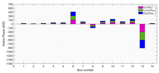 Figure 13 depicts the balance of power in the system concerning the minimum demand situation. At maximum demand, the power level for every bus decreases. For this situation, the characteristics of distributed generation are specified, leaving diesel generator 8 connected to the bus. At the same time, the remaining inactive power contribution is made through bus 13 connected to the grid.