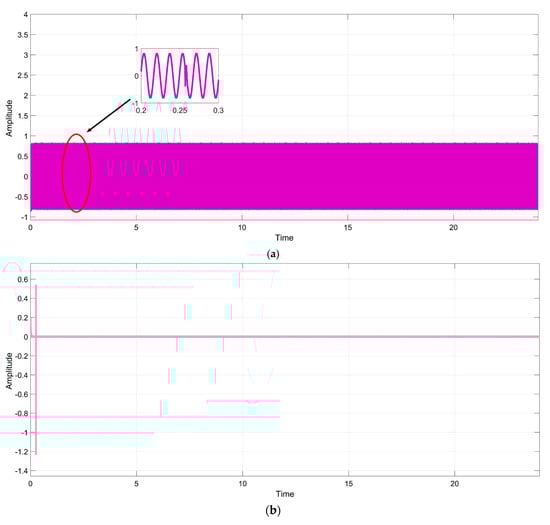 Figure 14 illustrates the PR controller’s output signal (a) and the error signal (b) that are produced during the 180-degree reference shift. The primary argument is that PR-controller has an output signal that is often less than one. As the pulse width modulation has an amplitude of one carrier, saturation is not achieved by the built PR controller in transitional and steady times.