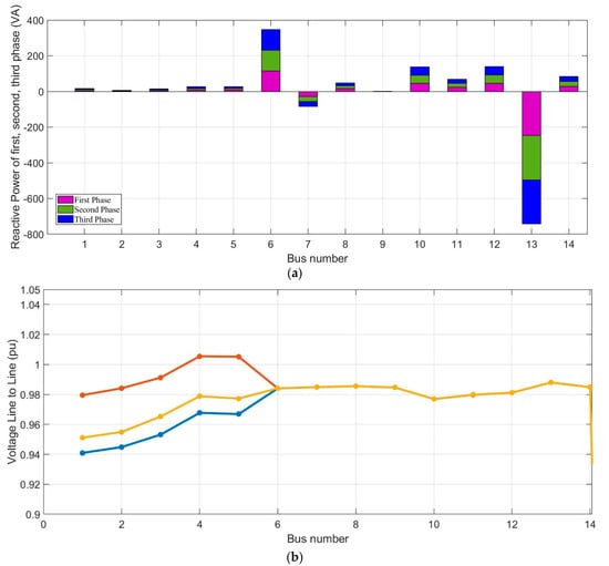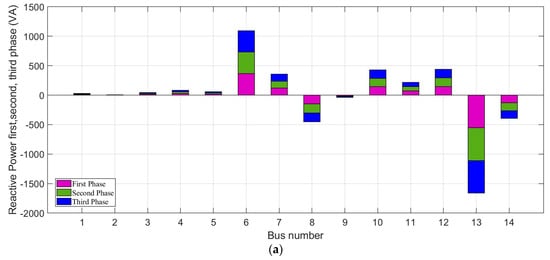 Figure 17 highlight system characteristics at the maximum and minimum demand levels, respectively. Bus-specific voltage profiles, reactive power balances, changes in voltage phase angles, are depicted in the abovementioned figures. In both situations, it can be observed that there is an association between reactive injection and the voltage increment at the bus, where the present power generation compensates for reactive powers. The reactive powers of systems are observed using Bus8 having diesel generators, and Bus13 having external reactive power. Nevertheless, as depicted in