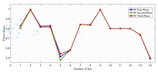 An important result is obtained by comparing the power factor for both scenarios (minimum and maximum demand). Most buses have a much better power factor than the maximum demand scenario under low demand conditions. The relationship of reactive power reduction for the maximum demand with the minimum demand scenario is the same as the reactive power reduction. The grid will continue to have the same power factor as the results of this analysis. However, the maximum demand is 0.73, while the minimum demand is 0.77.