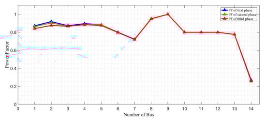 Figure 19 demonstrates the scenario of high demand showing how bus 2 and bus 9 have a power factor of approximately 1. It is because bus 2 is only involved with a maximum demand obtained from the DC microgrid.