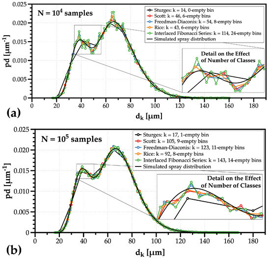 The purpose of remarking the difference between probability and probability density distribution is particularly relevant when comparing experimental with simulated drop characteristics. In the case of using a probability distribution (), the number of classes must be the same, or the representative values of each class ( for drop size and for one velocity component). Otherwise, if the presentation of spray data opts for the probability density distribution, which is dimensional ( [m]), it is not necessary to use the same number of classes. Ultimately, to avoid erroneous comparisons between experimental and simulated data, it is essential to be clear about the approach followed when presenting spray data in statistical format. The question is why one should change or tune the number of classes when describing the spray characteristics.
