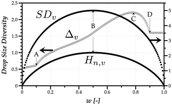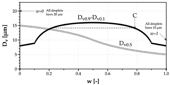 The first observation from Figure 4 is the similarity between the other indicators () and the evolution of the difference D–D, in the numerator of , as a function of w with a maximum value at . However, because the relative span normalizes this difference by , which continues to decrease as the number of 10 m droplets in the mixed spray increases, grows and indicates, for no reason, an increase of the drop size diversity until point C, when it is not the case. This theoretical example shows the limitations of using the relative span as a reliable tool to quantify the drop size diversity in a spray.
