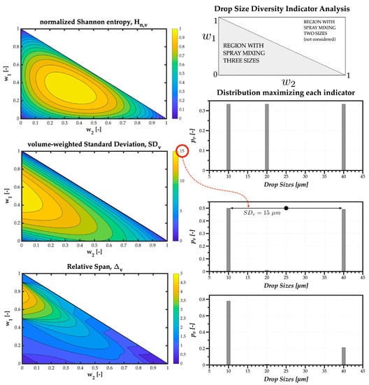 The second observation are the implications of probability values for each isolated distribution for the normalized Shannon entropy and the volume-weighted standard deviation. Namely, the lower probability values for the distribution with larger diameters, indicates a higher number of relevant droplets in the spray relative to the distribution with smaller drop sizes, . Accordingly, the values for and are higher for w = 0 compared to w = 1.