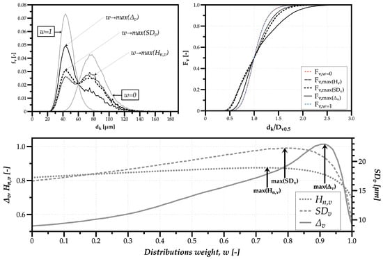 Considering a total sample of droplets, the simulated spray fixes the shape of both distributions mixed with , and uses distinct geometric mean diameters of m and 70 m to mix sprays around larger and smaller drop sizes. The weight corresponds to the Log-Normal distribution of m and to the distribution around smaller sizes. Figure 6 shows on the top left the volume-weighted drop size distributions simulated with w = 0, 1 and the distributions corresponding the the maximum values obtained for the normalized Shannon entropy (), volume-weighted standard deviation (), and relative span (). The number of classes used the Rice Rule (see Section 1). On the top right are the corresponding volume-based cumulative drop size distributions. Below is the comparison of all indicators for the Drop Size Diversity with the variation of the weight w attributed to each distribution.