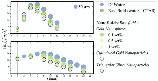 Figure 7 depicts the mean velocity of the droplets of the hollow cone spray structure for different working fluids and the size of symbols is proportional to drop size. These fluids are distilled water and a water based solution with a surfactant named CTAB-cetyltrimethylammonium bromide (water + 0.05 wg% CTAB). Different mettallic nanoparticles added to the base fluid are what forms the so-called nanofluids, i.e., liquid based suspensions of nanometer-sized particles (<100 nm). The surfactant is added to stabilize the suspension, precluding particles clustering and delaying their deposition. The purpose of nanofluids is to produce liquids with enhanced thermal properties, for example, a higher overall thermal conductivity for thermal management applications like spray cooling of high-power electronic devices. However, the addition of these nanoparticles may change the liquid’s thermophysical properties, i.e., the viscosity, thus, is likely to alter the atomization processes and the spray characteristics.