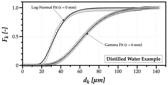 Despite their value, reporting mean quantities limits spray characterization. The presentation of the results should increase the informational value of data, and enable the reconstruction of the measured distributions compared to reporting its moments alone. Therefore, one could investigate if probability mathematical functions, such as the Log-Normal, Gamma, Weibull, and Nukiyama–Tanasawa can describe the histograms organizing the spray drop sizes by classes. Figure 8 shows examples for the distilled water spray in two radial locations, where the fitting functions that best described the probability of presence of droplets in the spray at r = 0 mm the Log-Normal—Equation (6)—and at r = 6 mm Gamma- Equation (7), probability distribution functions.