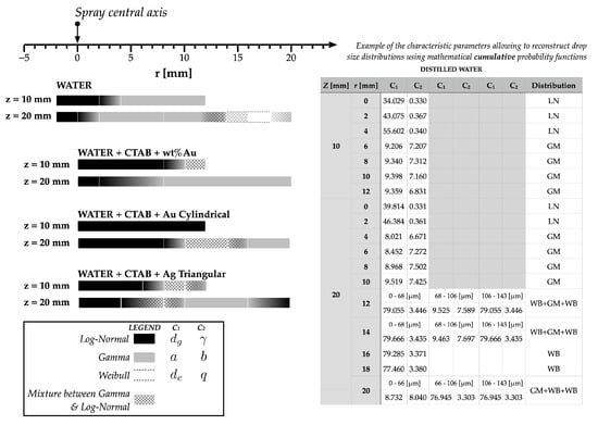 Using a Kolmogorov–Smirnov test to evaluate the best fitting, including combinations of probability distribution functions (pdf), Figure 9 maps the results for Z = 10 and 20 mm. On the right, it shows an example for distilled water of the pdf characteristics allowing the reconstruction of spray data at the measured locations, where and are the scale and shape parameters for each kind, also included in the legend. It is noteworthy that the Nukiyama–Tanasawa empirical distribution did not produce the best fitting in any measurement point, spray condition, or contribution to a mixed cumulative distribution function.