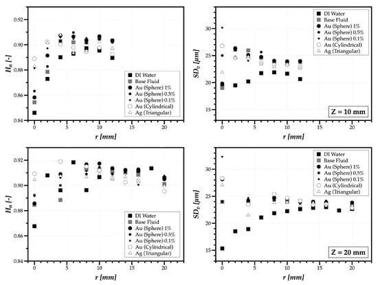 In the case of distilled water, the results show a higher polydispersion degree around mm, where the spray heterogeneity degree also becomes higher. However, despite local changes in , the behavior does not seem significantly affected by adding surfactant to produce the base fluid, and further adding nanoparticles. However, in terms of heterogeneity, the results are different. The addition of surfactant exerts a major effect on the heterogeneity of the spray characteristics. However, the addition of nanoparticles produces a negligibly effect. Consequently, one may also expect a minor effect of the nanoparticles during spray impact. This can actually be a beneficial feature, for instance, in spray cooling applications, as it suggests that the nanoparticles can be used to alter the thermal properties of the working fluids, without significantly affecting the main spray characteristics.